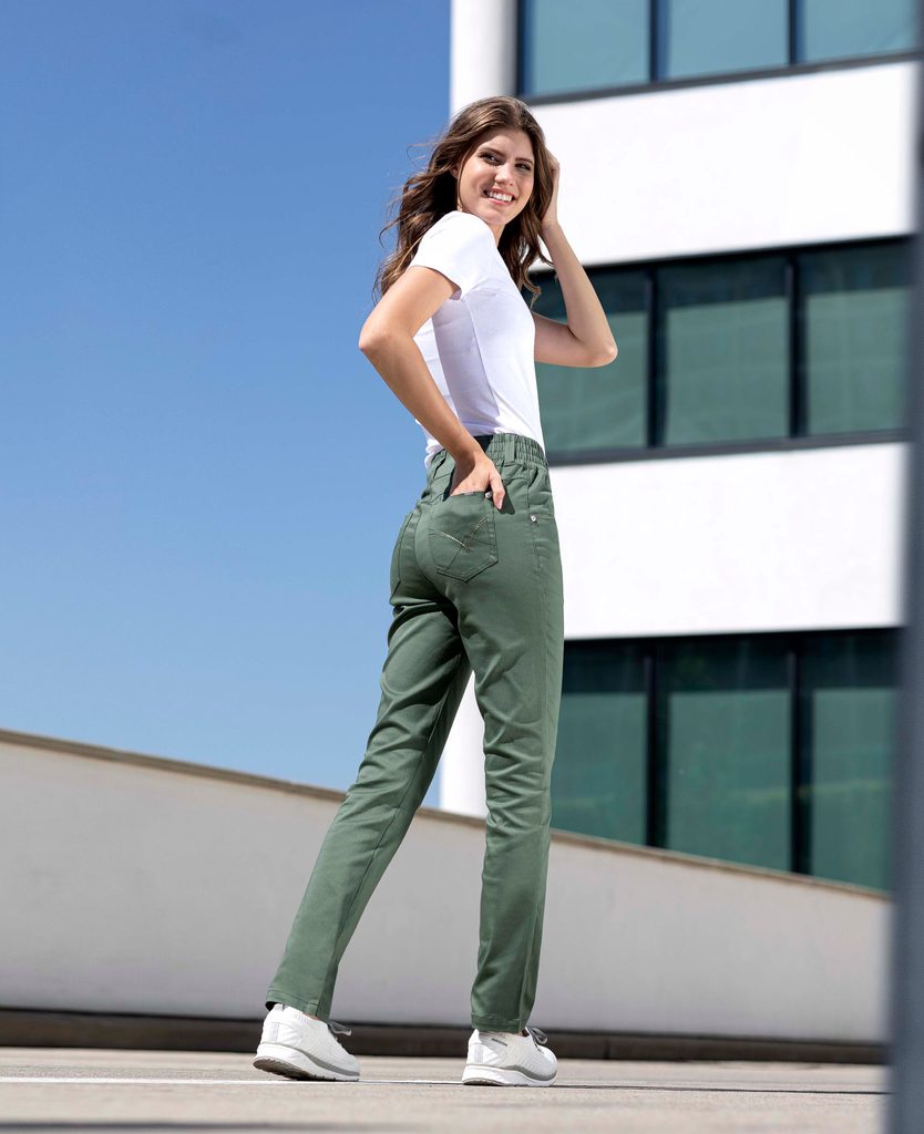 Elegantné dámske nohavice z elastického materiálu so zvýšeným pásom, ktorý je navrhnutý špeciálne pre ženy. Vďaka nemu, elastickým vložkám a širšiemu pásu nohavice dokonale priliehajú na telo. Majú tiež prepracovaný 3D slim-fit strih, ktorý sa spolu s elastickým materiálom dokonale prispôsobí rôznym typom postavy. Tento bavlnený elastický materiál je veľmi ľahký, priedušný a dobre absorbuje vlhkosť, čo je príjemné najmä v letných mesiacoch. Je príjemný na dotyk a vysoko elastický s pamäťovou schopnosťou. Nohavice majú 2 predné vrecká s dizajnovým prešívaním a zadné vrecká džínsového strihu doplnené výšivkou.