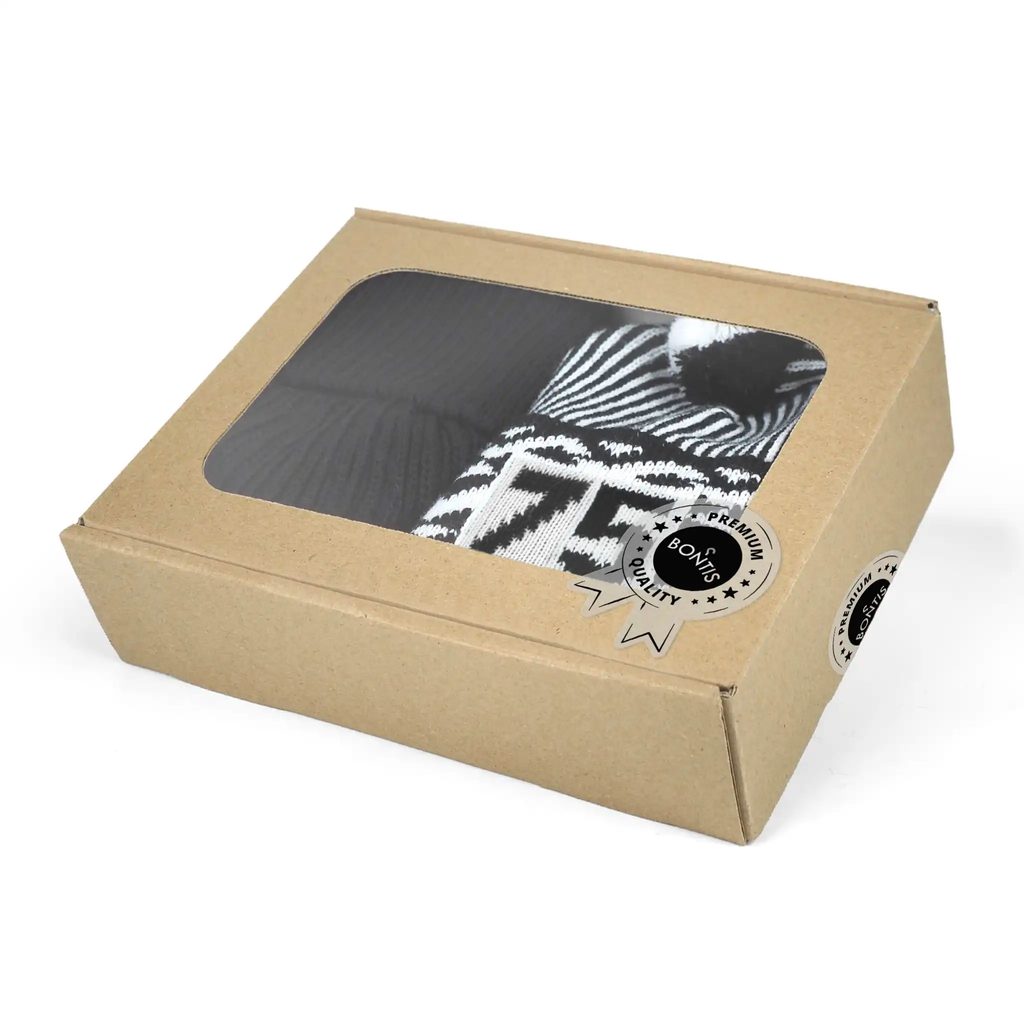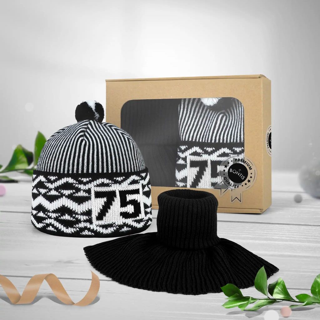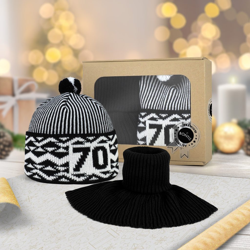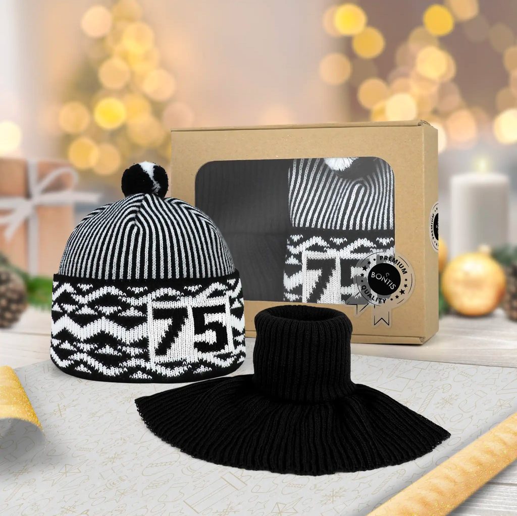 Luxusný darčekový set, ktorý spája legendárny štýl a zimné pohodlie – Narodeninová Budajka Bontis s vypleteným číslom a hrejivý nákrčník v elegantnej krabici.