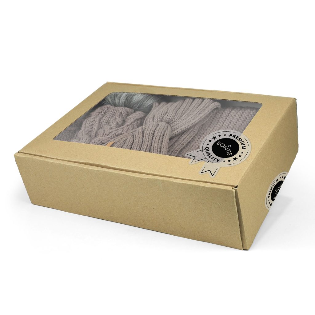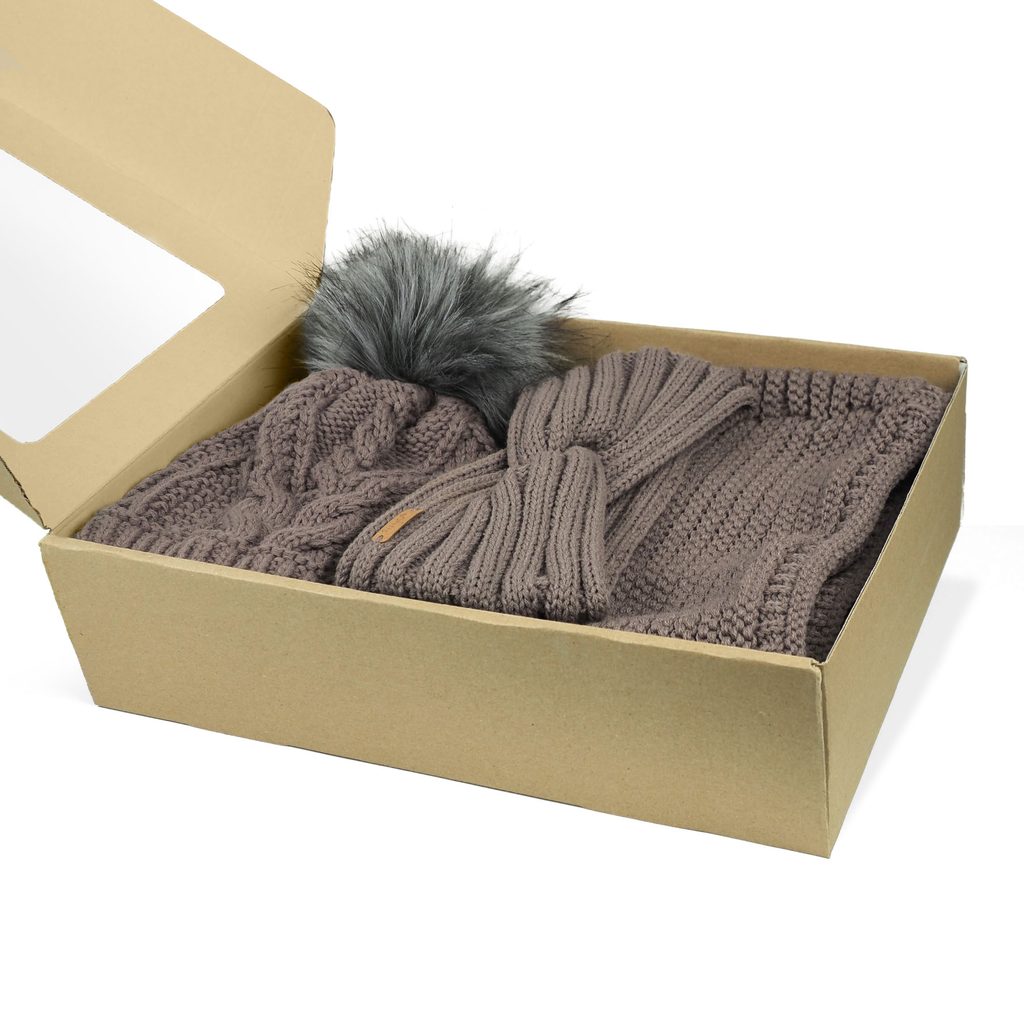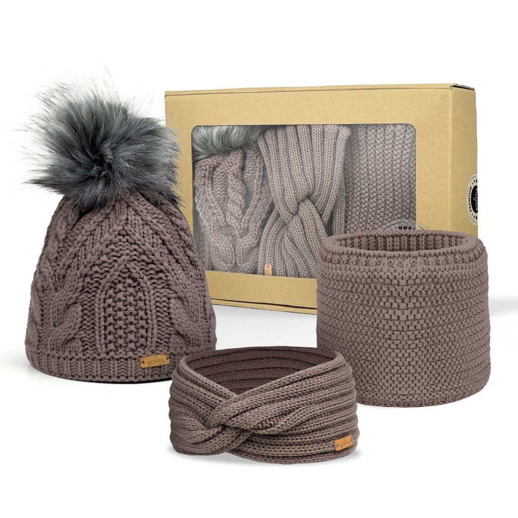 Darčekový set, ktorý spája nádych luxusu so zimným pohodlím – pletená čiapka s kožušinovým brmbolcom, prekrížená čelenka a hrejivý tunelový nákrčník.