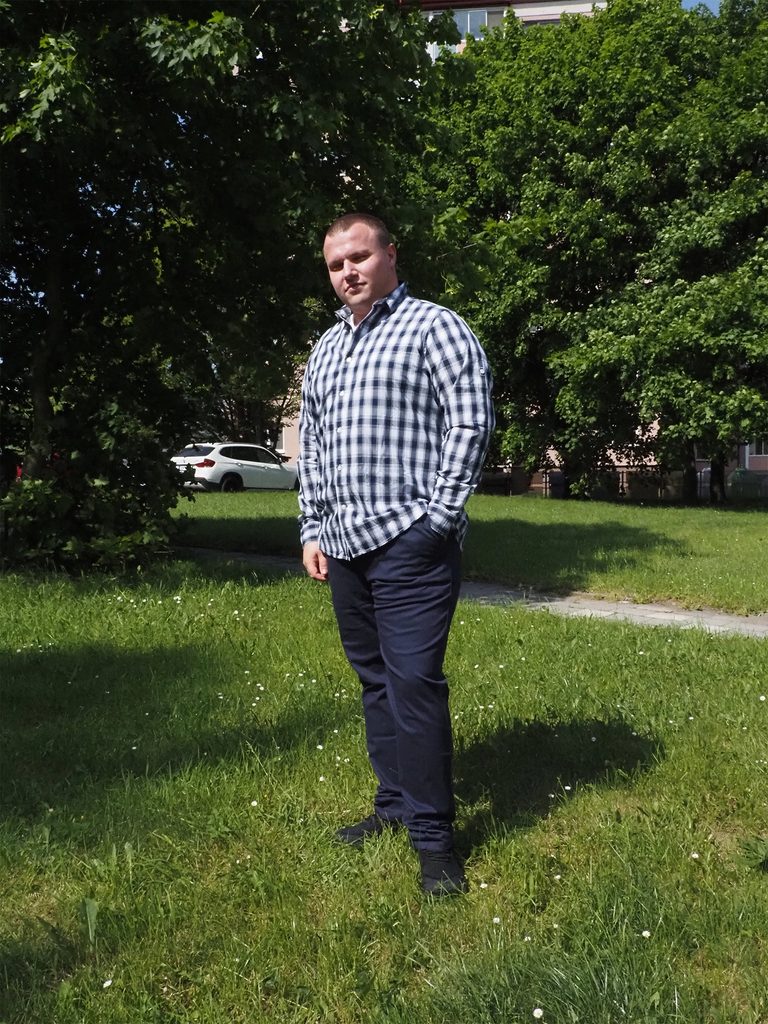 Módna pánska bavlnená károvaná košeľa v polopriliehavom strihu je univerzálnym doplnkom pánskeho šatníka. Môže byť ležérna s rozopnutým golierom a vyhrnutými rukávmi alebo elegantná s golierom na gombíky a dlhými rukávmi na 2 gombíky. Rukávy sa dajú zapnúť v vyhrnutej polohe pomocou opasku a gombíka v hornej časti ramena. Golier košele je úzky a mäkký.